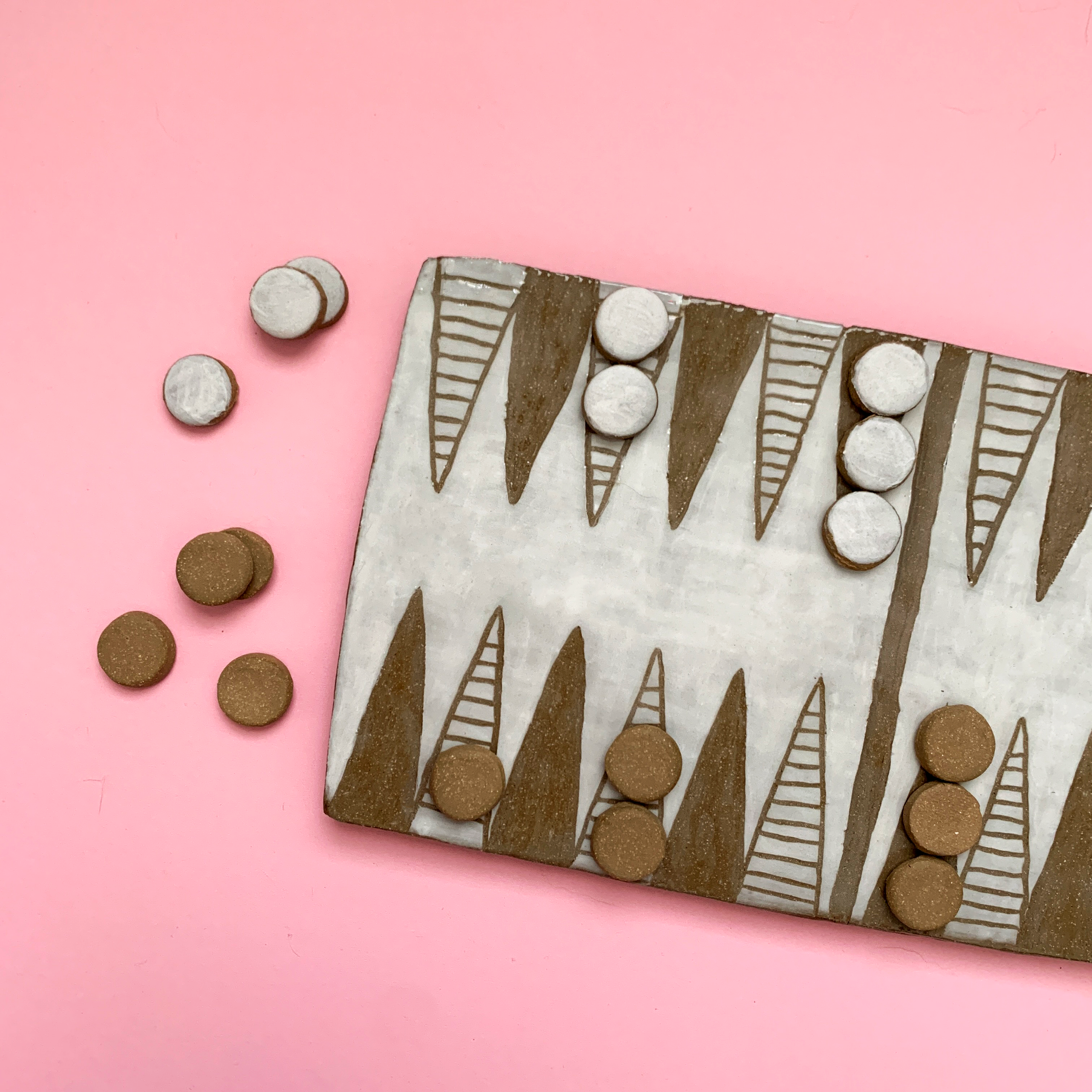 Hand built backgammon board. Brown clay. White Slip. Glaze.